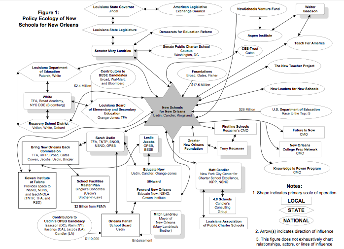 Indeed, the Warning to Communities charts the elite policy network that surrounds school reform in New Orleans. It serves as a startling reminder that there is big money and powerful interests purposely manipulating human capital and charter school development at local, state, and national levels:
