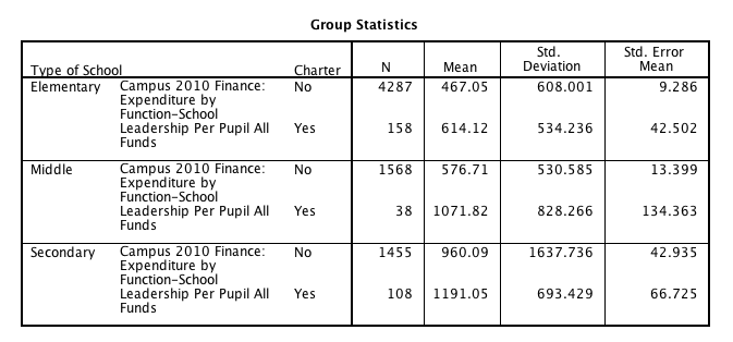 I received a question over email querying if charters spend more on administration aka school leadership. I used t-tests to compare school leadership per pupil spending means from the 2010-2011 school finance data (the most recent cleaned dataset on my laptop) for all schools in Texas. Here is what I found: