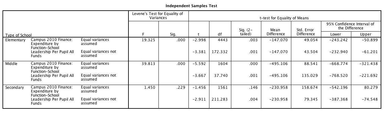 The independent t-test show that for all schools in Texas the higher administrative spending by charters is statistically significant (alpha<.000) for elementary and middle school levels but not for high schools.