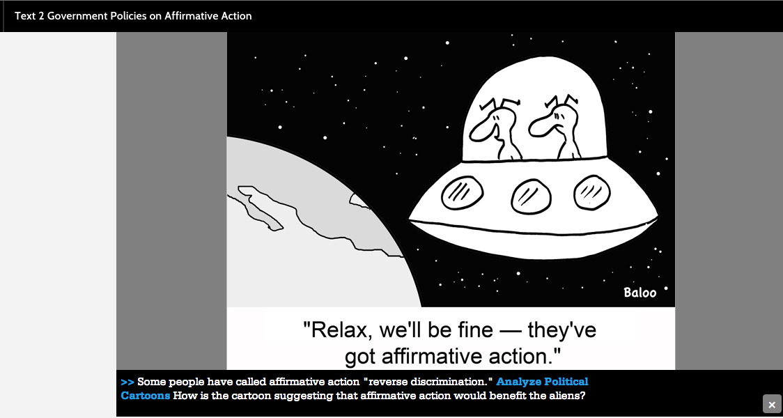 So about those aliens and their social studies ideas. Maybe you had thought you had heard it all from Texas educational policy cowboys. But alas, no. Texas is using aliens in cartoon to push a “conservative” (hostile) perspective on Affirmative Action in the social studies curriculum.