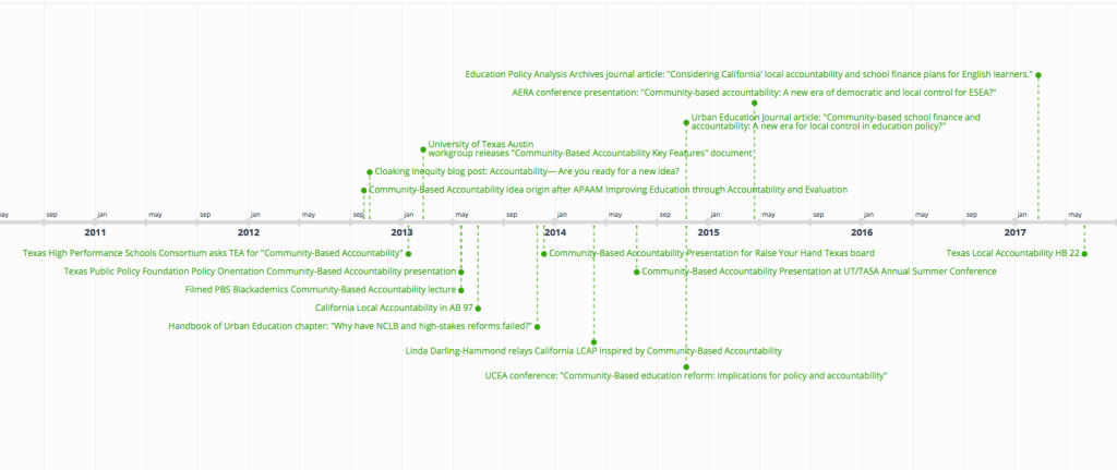 California passed Local Control Accountability Plans (LCAPs) in AB 97. Linda Darling-Hammond told me during a private dinner at AERA in Philadelphia that the idea for the California LCAP plans was inspired by the community-based accountability ideas that we developed at UT-Austin.