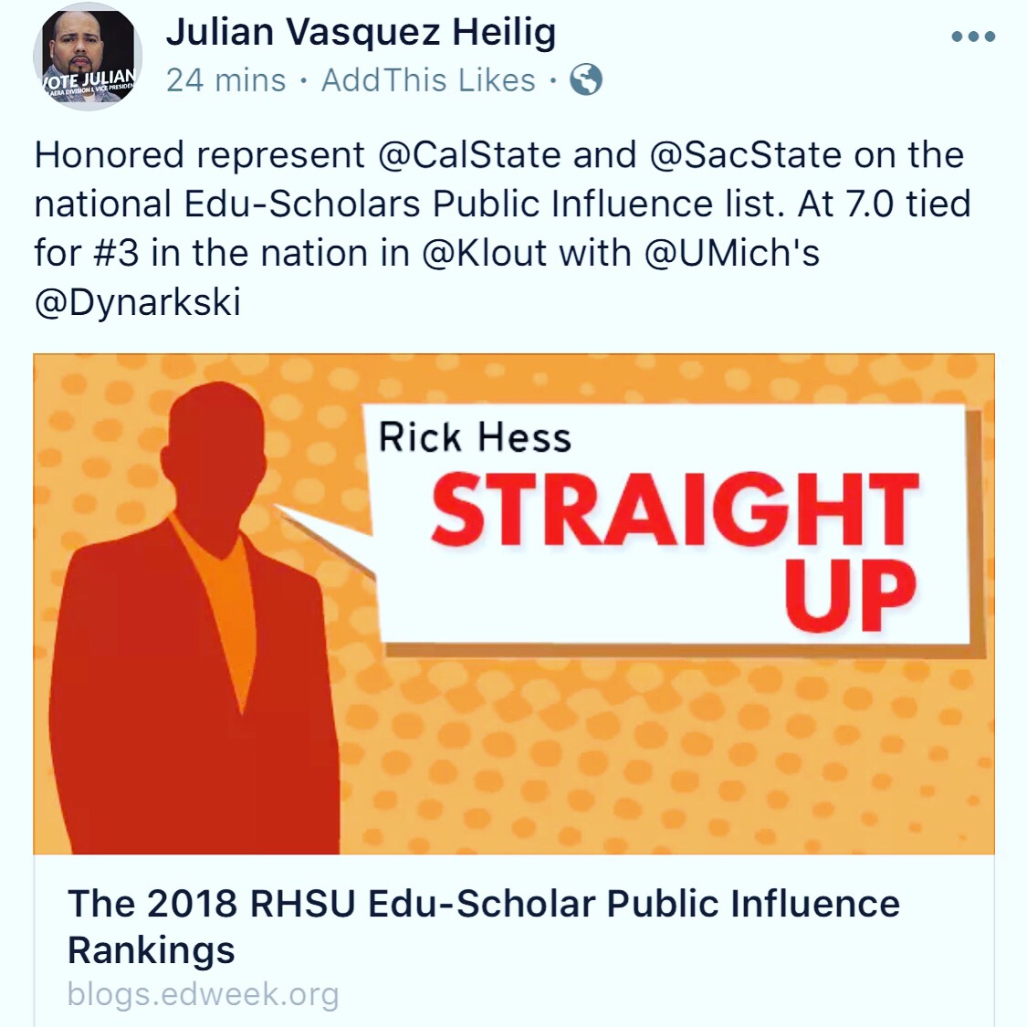 Heilig’s online presence was also recently recognized by Education Next, where he ranked eighth on the journal’s “Top Education Policy People on Social Media” list, which includes not just academics but anyone involved in education policy.