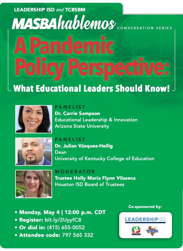 Free Education Policy Webinar today: Join the Mexican American School Boards Association at 12 p.m. EST for “Pandemic Policy Perspectives” with @HoustonISD Trustee @HMFV1, @DrCSampson of @ASU & @ProfessorJVH of @UKCollegeofEd