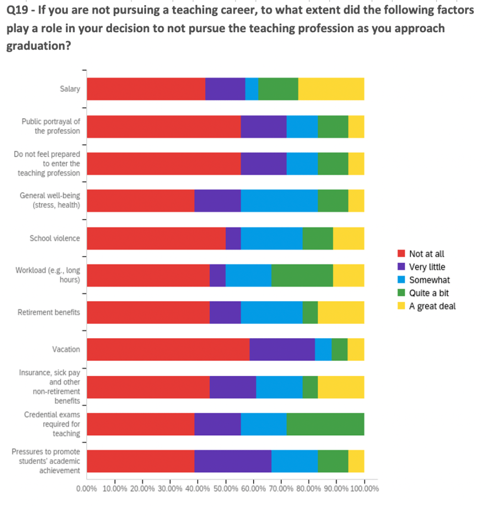 The predominance of the peer reviewed research has indicated for quite awhile that pay, benefits, retirement and other factors are very important to new and veteran teachers. I think the comments to policymakers are also quite revealing and demonstrate that students are clearly discouraged by the current educational policy environment. This survey is not a comprehensive survey of all new teachers, but this sample of the questions does provide insight regarding the needs and desires of the new teachers that will enter (or not enter) our public schools in the near future.