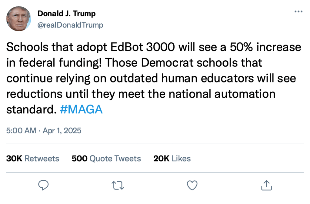 In alignment with the AI Education Advancement Act of 2025, being co-sponsored by Rep. Marjorie Taylor Greene and Rep. Loren Bobert, Donald Trump announced on X, formerly known at Twitter, that schools using AI-powered teachers will receive increased federal funding, while those clinging to human educators will face budget reductions.