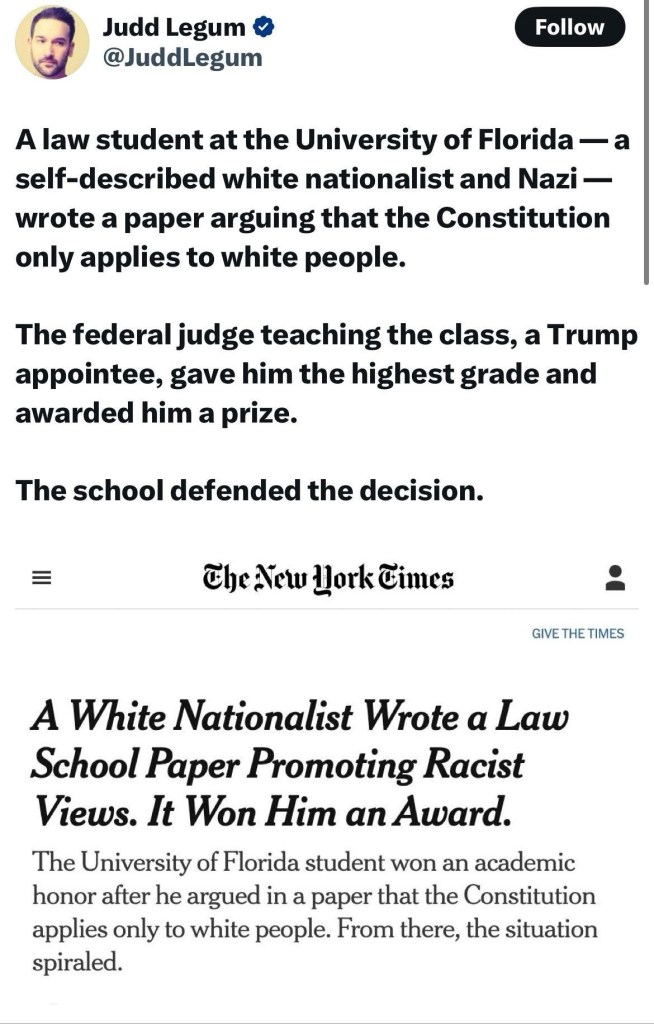 So when the Judge allegedly awarded that honor to a student allegedly calling for the removal of nonwhite people from the protections of the Constitution, he wasn’t just tolerating fascist rhetoric—he was elevating it.