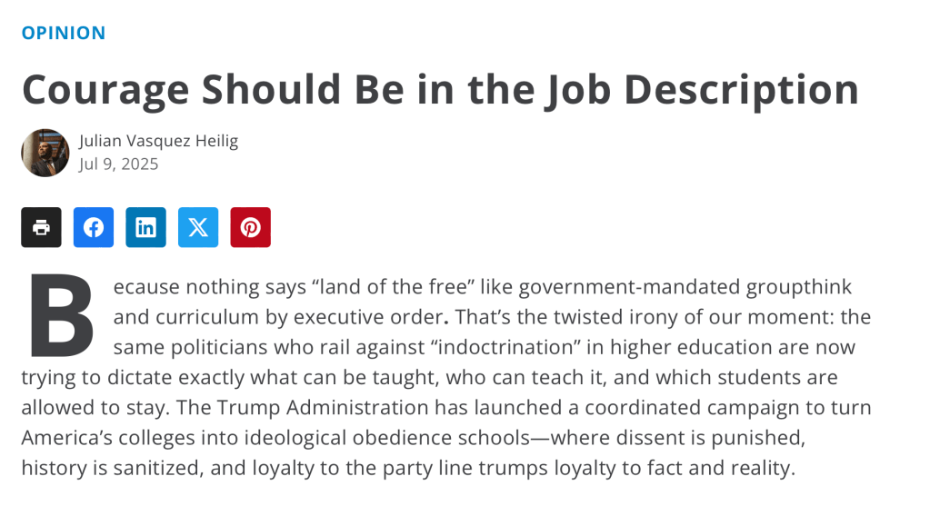 In my latest piece, I argue that it’s time to stop hiring caretakers and start demanding courage. Presidents and chancellors must be more than managers—they must be advocates. Fighters. Defenders of truth and equity. Because the cost of courage is high—but the cost of cowardice is higher.