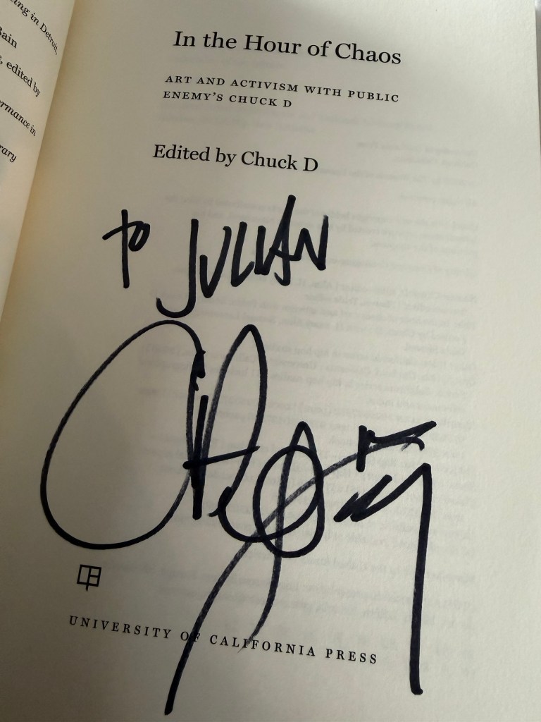 I was also honored that Chuck D signed my copy of In the Hour of Chaos. That moment meant more than I expected. It was not just about the book. It was about connection across time. From that car ride with Kermit to an academic conference in Los Angeles, the throughline became so clear! The music, the message, and the knowledge had stayed with me to fight.