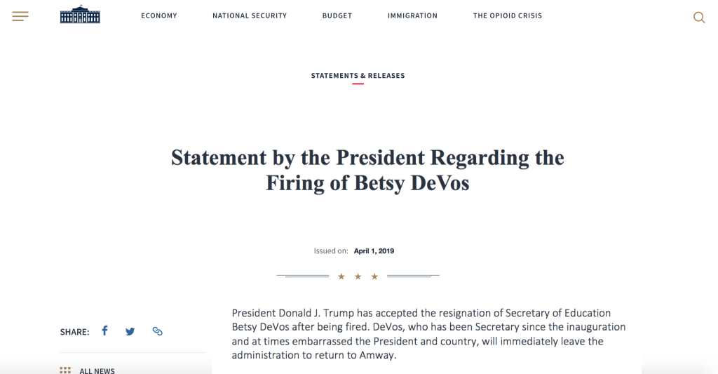 • Breaking News: Donald Trump fired Betsy DeVos this morning on Twitter